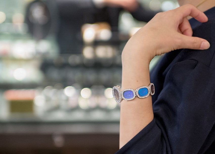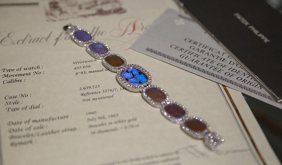 世界に1つだけの、ヴィンテージのパテック フィリップです。この時計には、絶滅危惧種といわれている、蝶の羽が使われています。文字盤やベルトに惜しげも無く使われているのがお分かりになりますでしょうか。