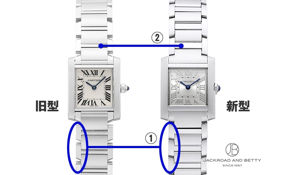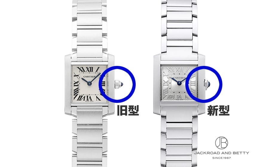 それでは新しくなったタンクフランセーズ スモールサイズについて、旧型モデル(白文字盤)と比較しながら主な変更点を見ていくことにしましょう。