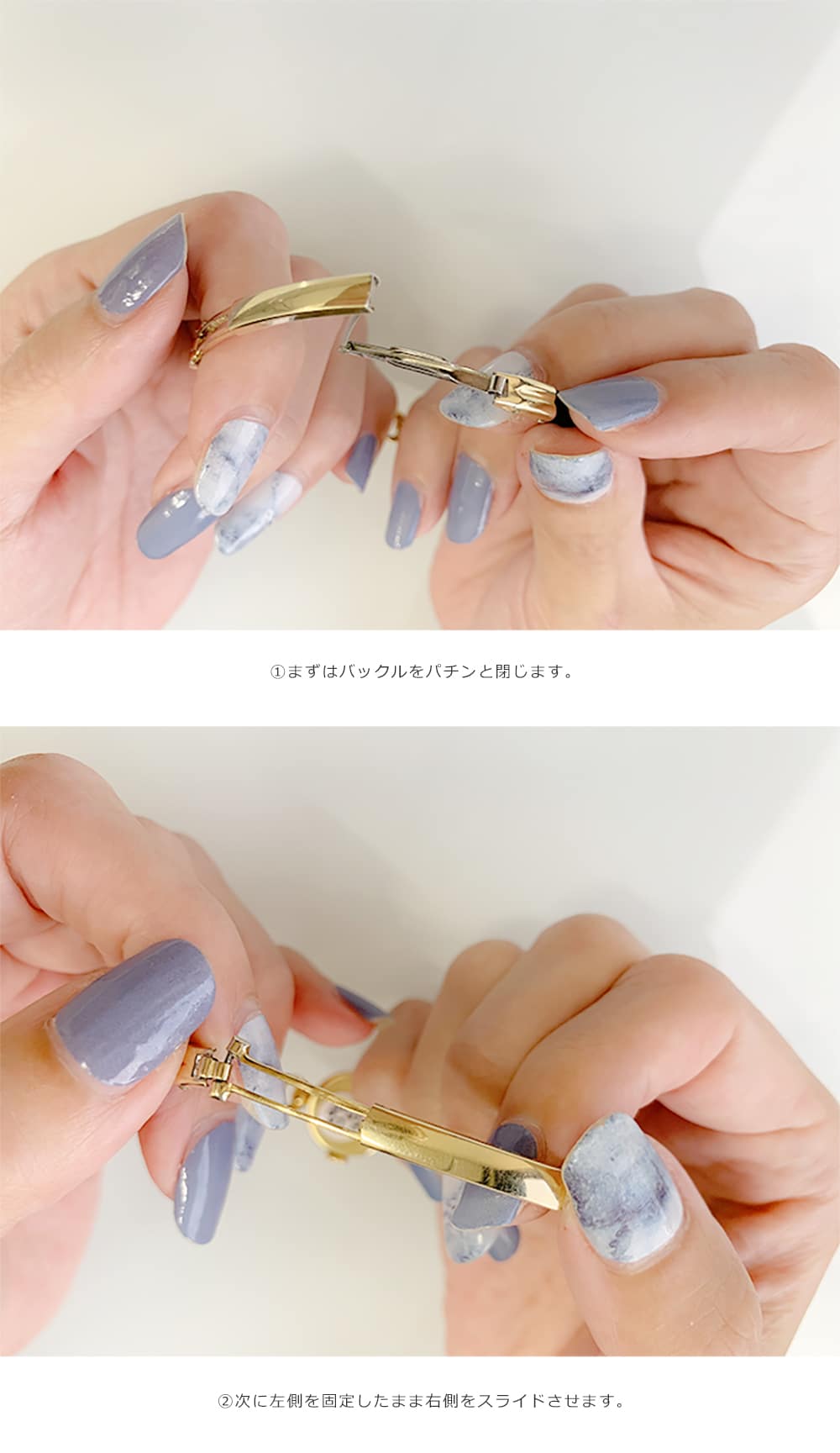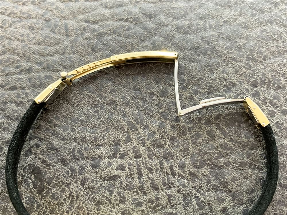 社外品のバックル(金張り)で簡単に装着、サイズの微調整ができますので詳しく見てみましょう。