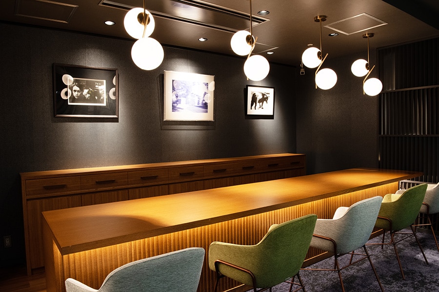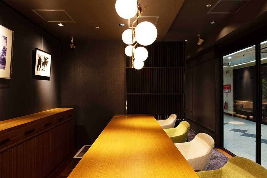新たに新設した商談ルームは黒を貴重としたシックな雰囲気に仕上がりました。高級感のある壁紙やインテリアを用いムーディーな雰囲気を醸しつつ、ウッド調のカウンターと温かみのある照明で全体的に落ち着いた空間となっています。
