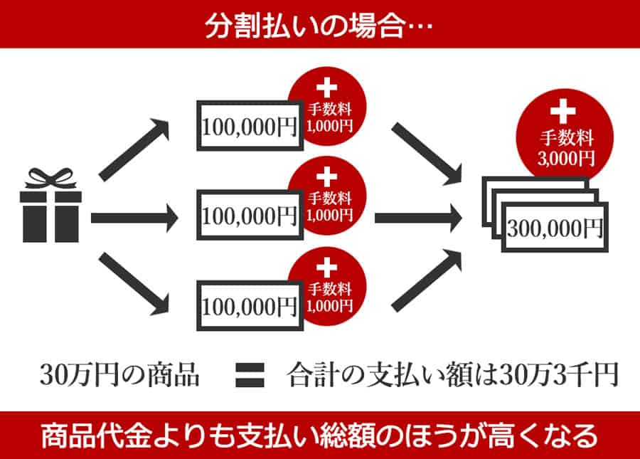 これを3回繰り返すとお支払い総額は30万3千円。現金一括払いに比べて3千円の手数料を余計に支払う必要があります。当然10回、20回、30回…と分割の回数を増やせば増やすほど、毎回手数料がかかるため分割手数料の合計も高くなっていきます。