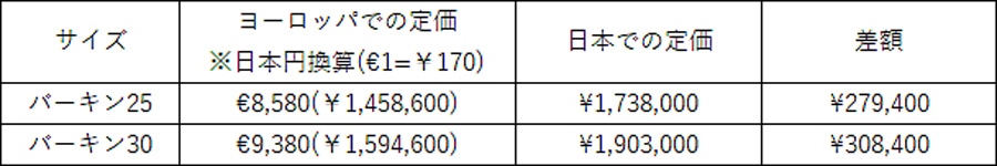 2024年2月の価格改定時点のバーキン40の値段を一覧表で紹介します。