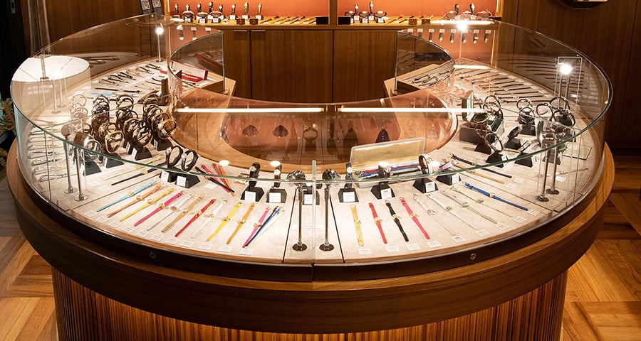 『やまとなでしこ』特別編放送前のベティーロードのヴィンテージウォッチ ディスプレイ。手前に30本以上並べられていたカメレオンが、ドラマ放映後の数日間で売り切れてしまった