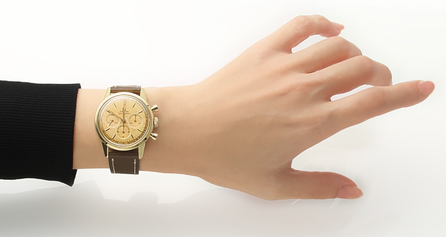 経年変化したオリジナル文字盤が味わい深い1960年代のシーマスタークロノグラフ。35mm径。ヴィンテージであれば、女性にちょうどいいサイズのメンズモデルを豊富に見つけることができる