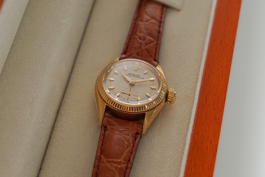 バブルバックとは裏ぶたが泡のように膨らんで見えることから名付けられた愛称で、ロレックスのパーペチュアル(自動巻き)機構黎明期のみに見られる大変貴重なもの。熱烈なコレクターも存在します。さらにいうと、この年代でピンクゴールドが使用されている時計は本当に数が少ないのです。