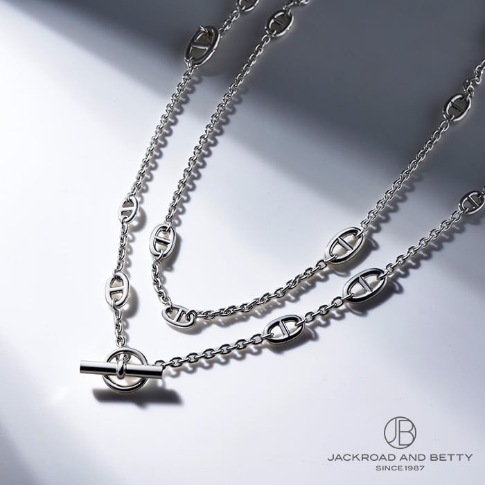 エルメスのシルバーネックレスといえば、高い人気と知名度を誇るシェーヌ・ダンクル。船の錨を繋ぎとめる鎖からインスピレーションを得たという、人と人との絆を想起させるメッセージ性豊かなデザインが魅力的です。