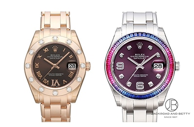 ダイヤモンド、サファイア、ルビーなどの宝石が巧みにセッティングされたジュエリーウォッチで、ブレスレットもこのモデル専用にデザインされたパールマスターブレスレットが装着されており、他モデルに比べても格別なラグジュアリー感が漂います。