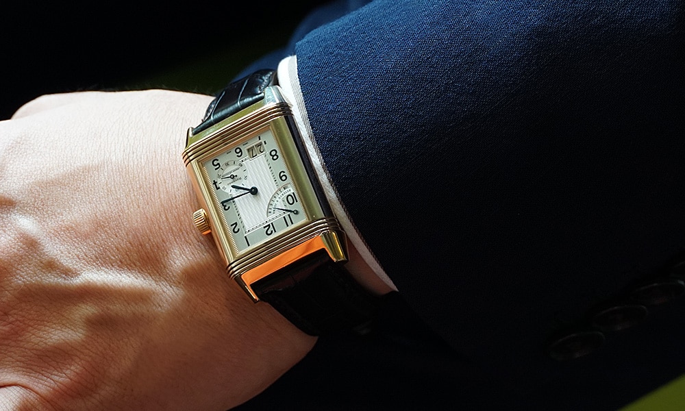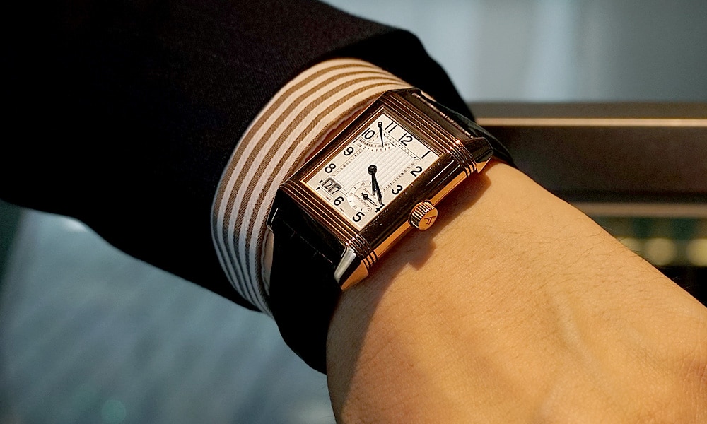 ジャガー・ルクルトのアイコン的モデルであるレベルソ。「レベルソ」とはラテン語で「反転する」という意味。その名の通り、ケースを横にスライドさせて裏返しにできる機構を備えています。