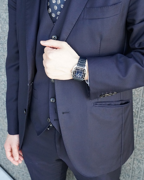 メンズウォッチだと四角い時計は各メーカーに1つラインアップがあるかないかというなかで、カルティエのこの形といえばやっぱりアイコンだし、絵になる雰囲気がある。大きさがあってもローマンインデックスのせいか不思議と上品に見え、使うほどにしみじみと「いい時計だな」と思えて。