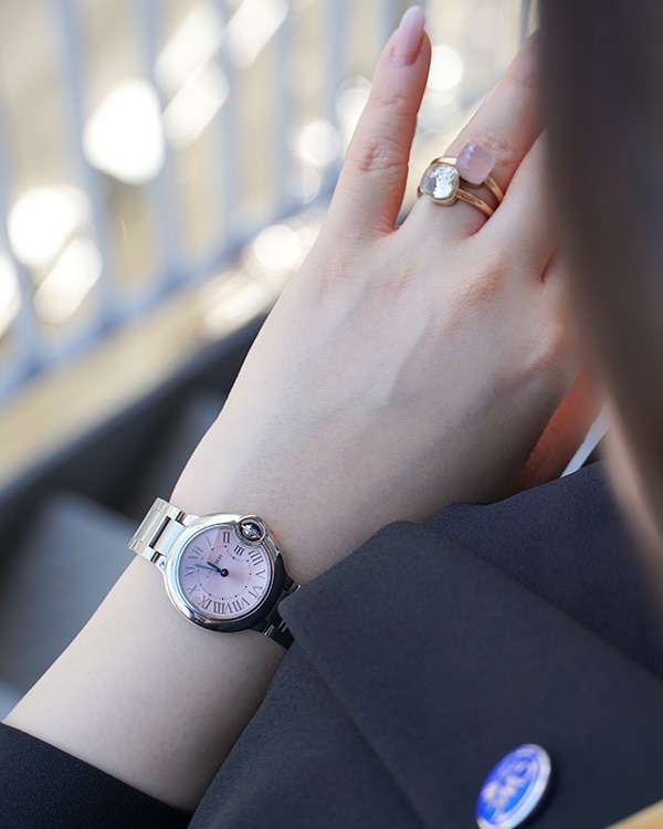 坂口 全体的に丸みのあるフォルムがお気に入りです。カルティエの時計は、それこそタンクフランセーズとかパンテールとか、四角い時計が人気というイメージがあると思うんですけど、丸い時計もすごく素敵なんですよ。