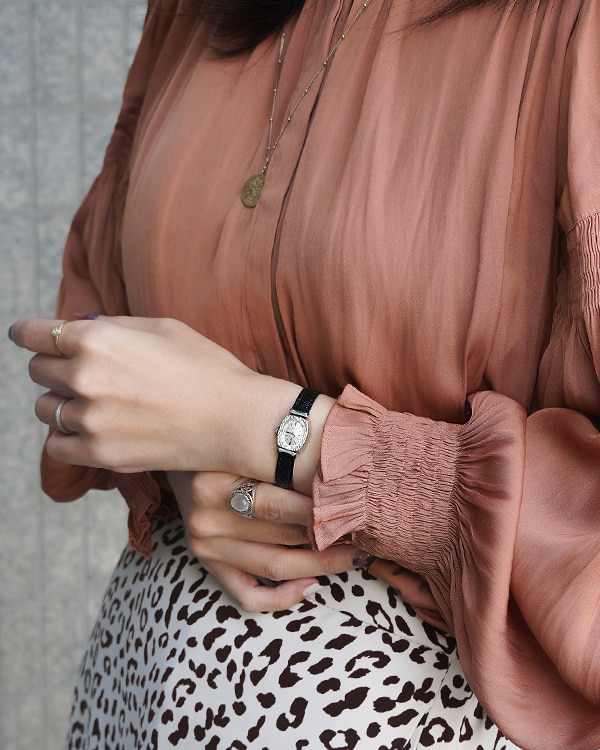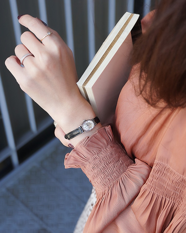 黒のリザードベルトは8mm幅。華奢な細ベルトがとても上品で、腕元に女性らしい印象を添えてくれます。