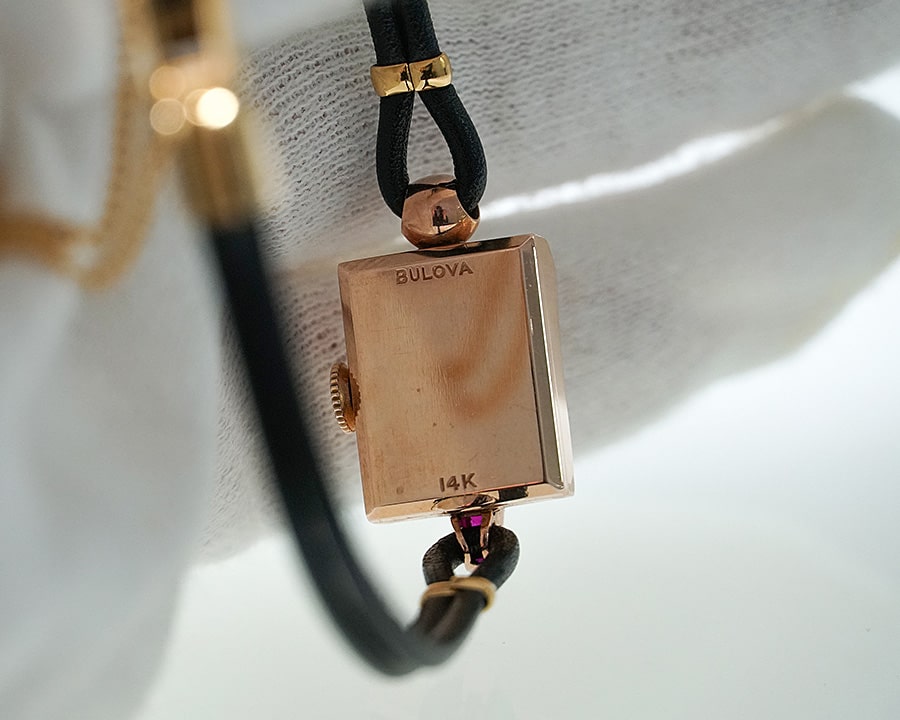 裏ぶたはBULOVAと14Kの刻印入り。内部には手巻きの機械式ムーブメントを搭載しています。