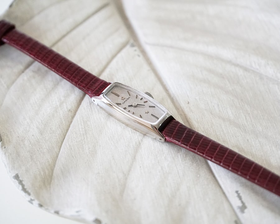 知的で落ち着いた雰囲気のトノー型ケースと、深みのあるワインレッドのストラップ。大人女子におすすめしたい名門オメガのヴィンテージ時計です。
