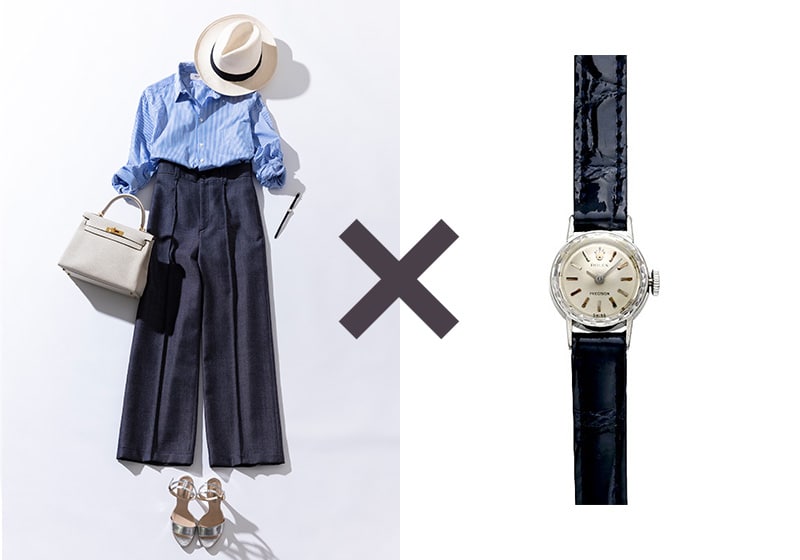「きちんとシャツ×腕時計は、カッコいい女性の鉄板コーデ。シンプルな極細ストラップのヴィンテージウォッチを合わせることで、キリッと機能的な印象はそのままに、さりげなく手首の華奢感を惹きたててくれます。