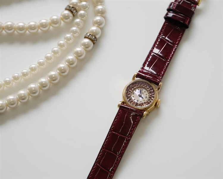 ガーネットの色味と合わせたワインレッドのクロコダイルストラップ。肌馴染みも良く、普段のコーディネートのワンポイントとしても重宝する1本。