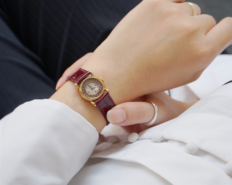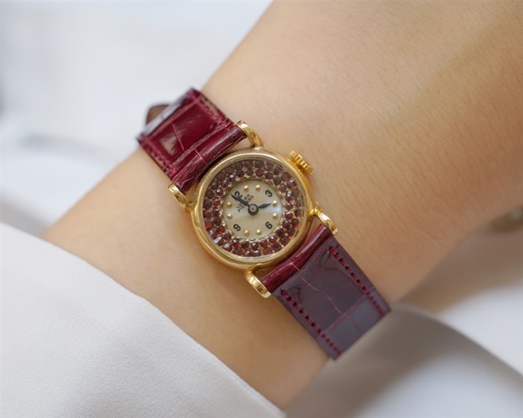文字盤に敷き詰められたガーネットがラグジュアリーな佇まい。多角的にカッティングされ動くたびに優美に輝きます。